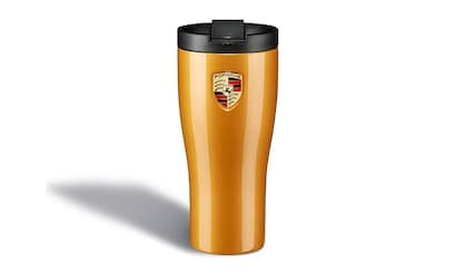 High-quality thermal mug in Golden Yellow Metallic. Made from double-walled stainless steel. Porsche Crest on the body and embossed 'PORSCHE' logo on the lid. Keeps hot drinks warm and cold drinks cool.