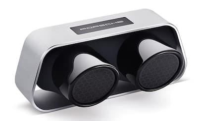 High-end speaker created from the twin exhaust module of a Porsche 911 GT3. Features top-quality materials such as the brushed aluminum casing. Bluetooth® 4.0 and apt-X technology for wireless audio streaming from smartphones, tablets and PCs in CD quality. 60-watt system performance. True wireless Modus, can be simply connected to end device using NFC technology. Battery life up to 24 hours. Size: 11" x 6" x 5". 7.5 lbs. Made in Germany.